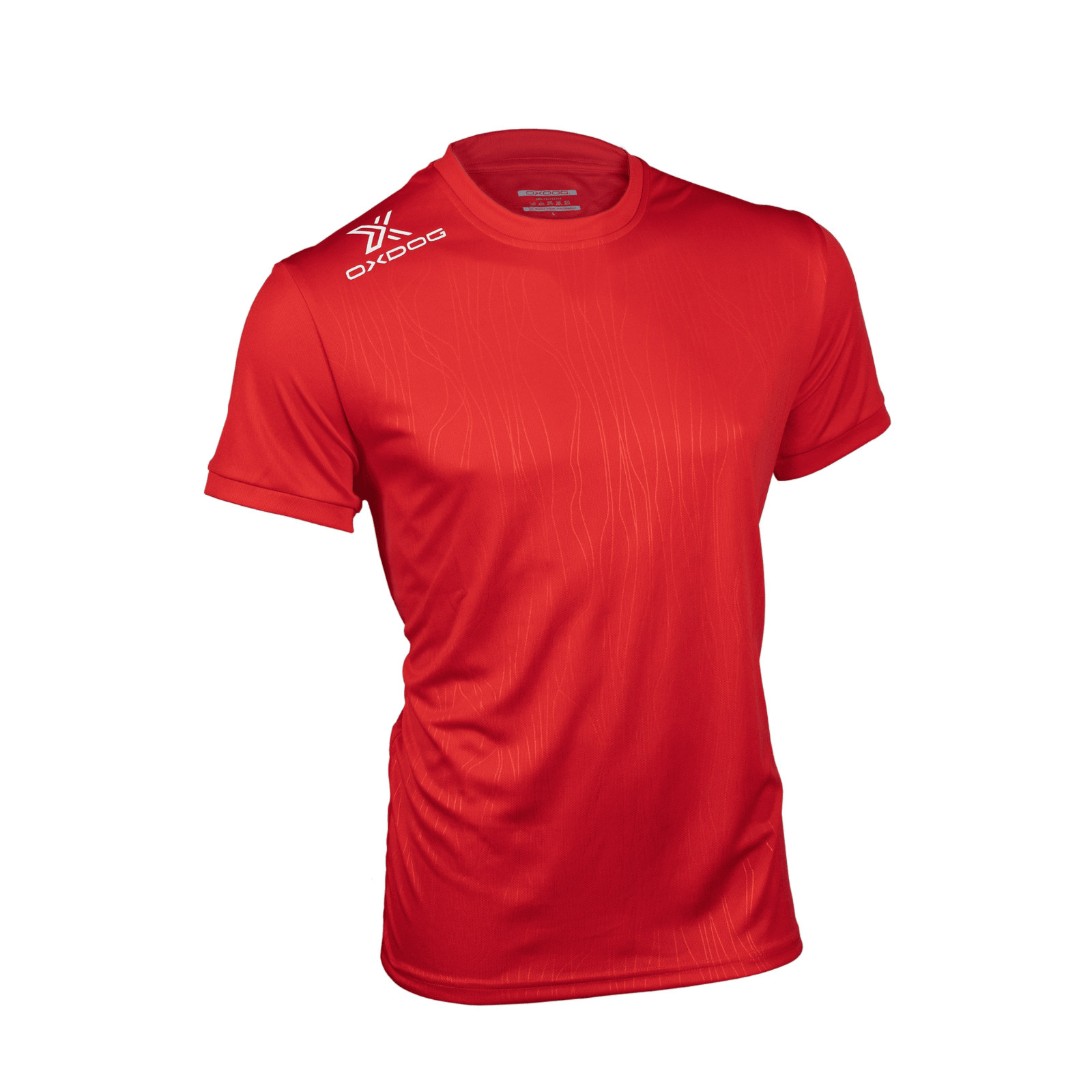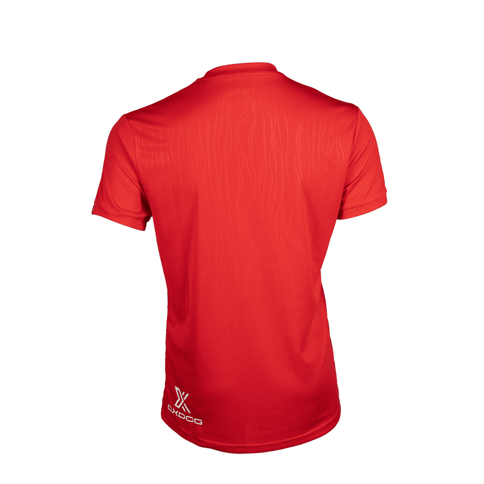 Camiseta técnica roja fabricada con material DryFast, con tejido 100% poliéster.